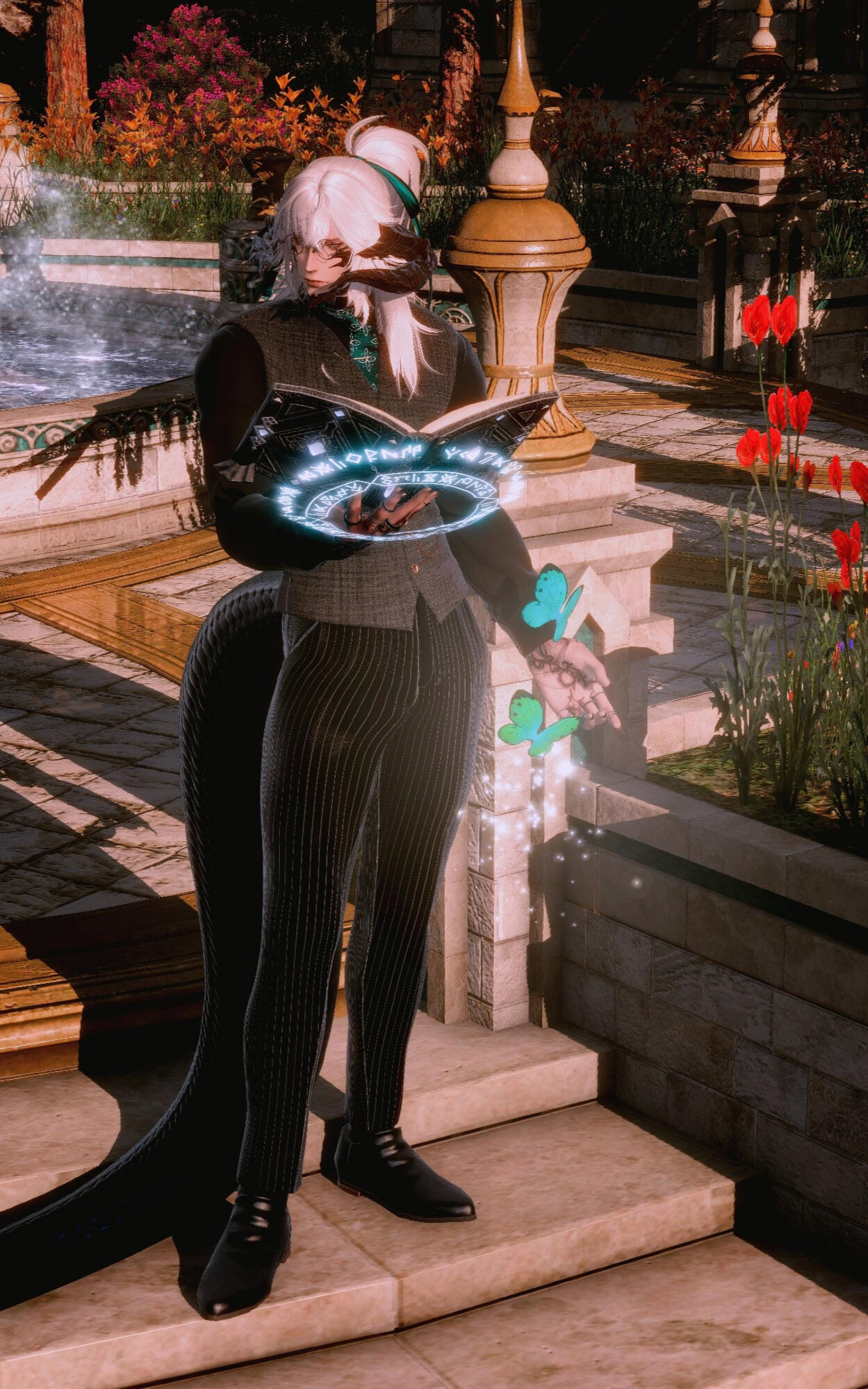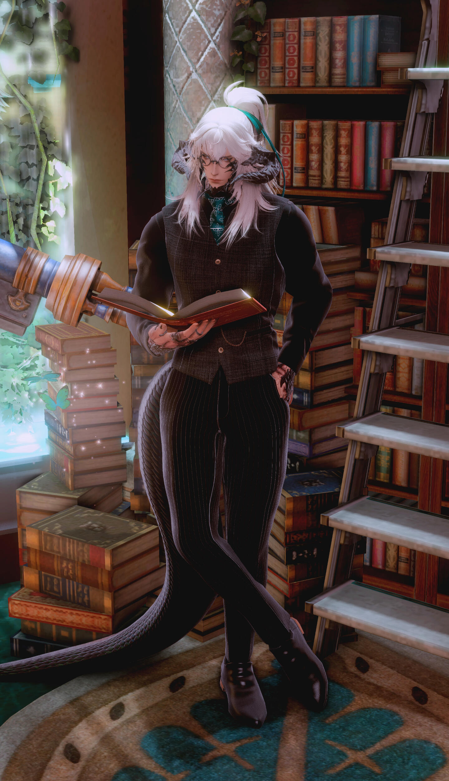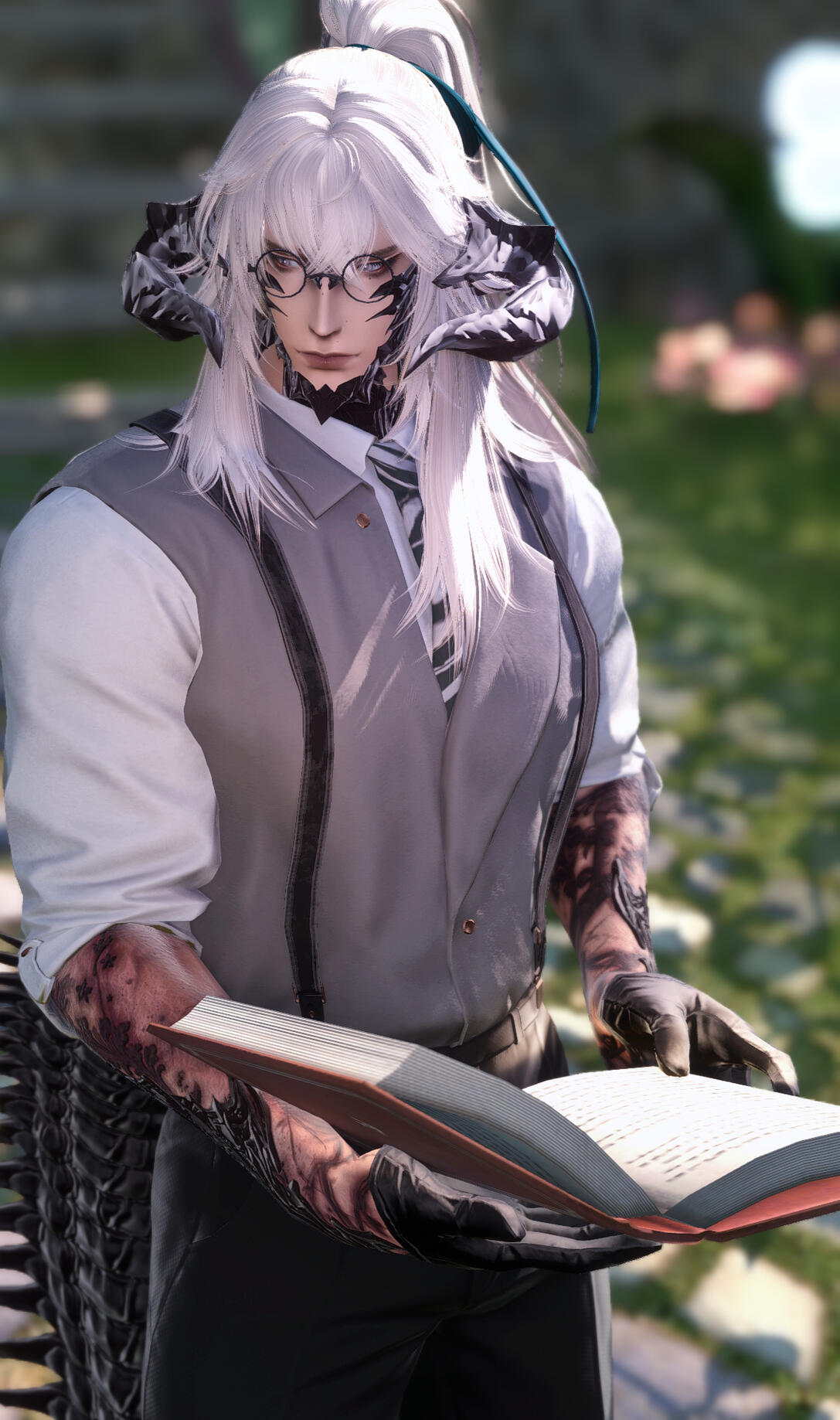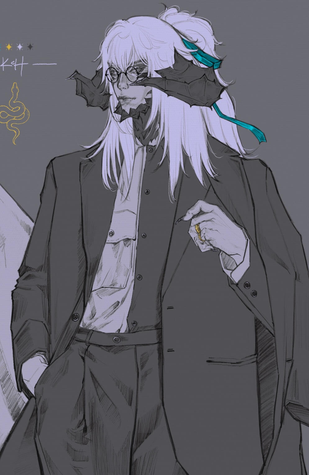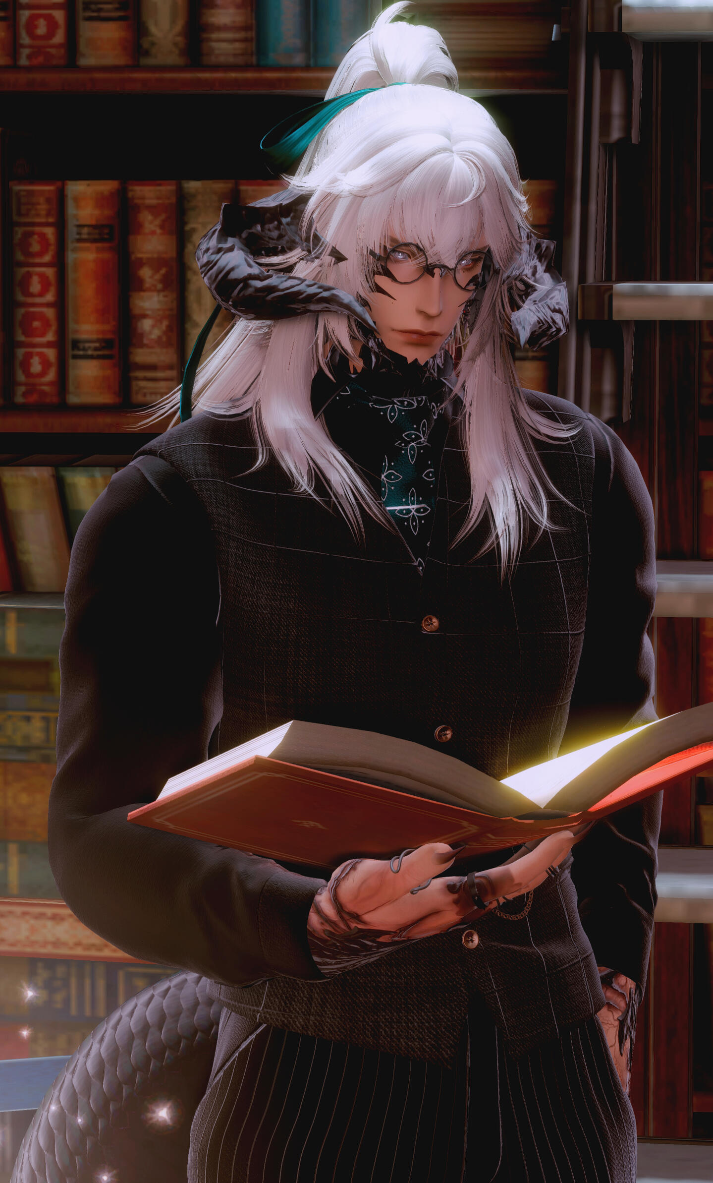 . features :. Quiet, beautiful man with a soft gaze. Often wearing circular black spectacles. Visible cataracts impair his vision over very far distances and in low light. A barely visible scar runs down the right side of his mouth, and the scales where the scar meets his jaw are broken. Half of his long hair is tied in a messy ponytail. Intricate burns race down both forearms, with barely legible text among the swirls. A handmade braided ribbon may sometimes decorate his right horn.. speech :. His sonorous voice is surprising— it sounds years older and deeper than it should, and it is often that someone will mention that it does not quite match his countenance. He may take time some time to reply, but his responses are soft and polite, formal, and one may notice he will forget to use contracting words altogether. Those attentive will notice he avoids opening his mouth too wide, even when smiling or laughing.. attire:. This man never fails to be impeccably dressed. He dresses elegantly, preferring formal three piece suits over more comfortable wear. He favors black, neutral colors and dark green fabrics, but rose gold, emerald greens, and pearl white for all accessories and hardware. All clothing is clearly tailored to flatter his form. He will very often put away his glasses for formal events. Minimal accessories are worn, as in time he has come to believe that less is more.. posture :. In familiar territory or private settings, he tends to stand with a lazy posture, commonly choosing to lean against furniture or counters, or slouching lazily over his sketchbook, drink, or meal. Otherwise he will quickly sit up or stand to his full height, especially in the presence of authority or person of interest. Someone observant might recognize the well practiced rigid posture of a former soldier.. quirks :. Most (but not all) of his mannerisms are faked or exaggerated, to better give the appearance of someone more approachable. Sweet and spicy flavor combinations are his great weakness, especially in candy and meats. His breath often smells strongly of coffee due to a caffeine addiction. When laughing or smiling genuinely, he will immediately cover his mouth or turn away. Painting took him decades to learn; all artistic creativity completely escapes him. You would be fortunate to never hear him sing, as his singing voice can be quite awful. A true citizen of Sharlayan, he has never bothered to learn to cook, especially not anything particularly tasty, only nutritious. Due to a complex upbringing, he lacks some basic knowledge including cooking, and feeding him something delicious and new will easily earn you his attention and affection.