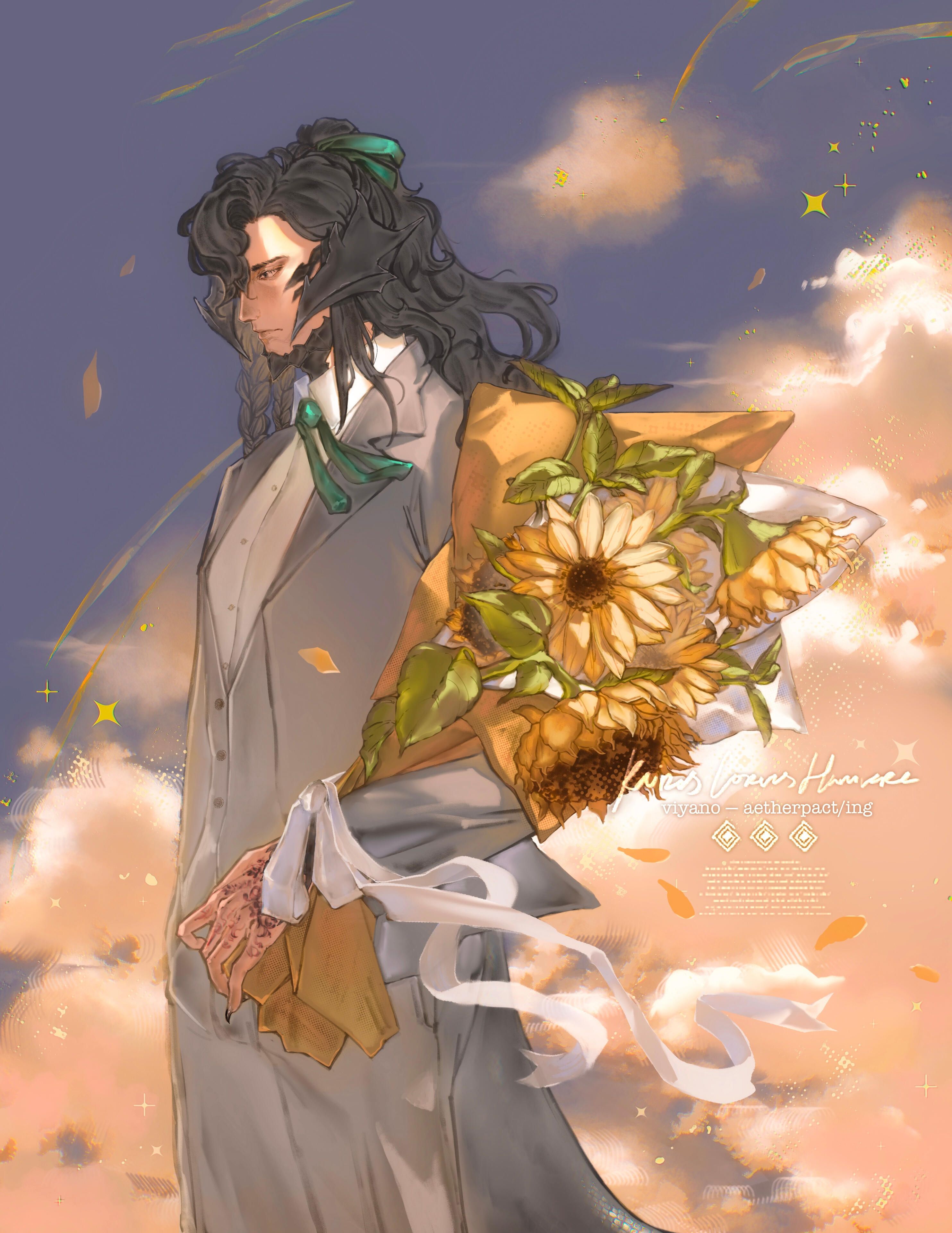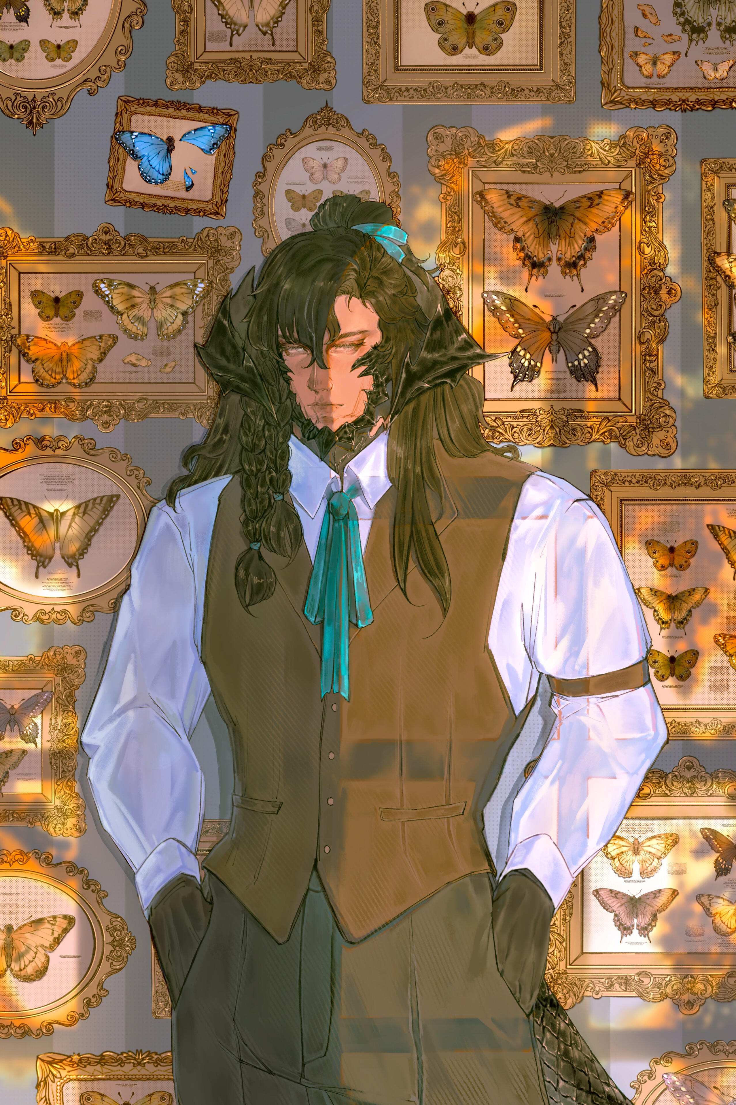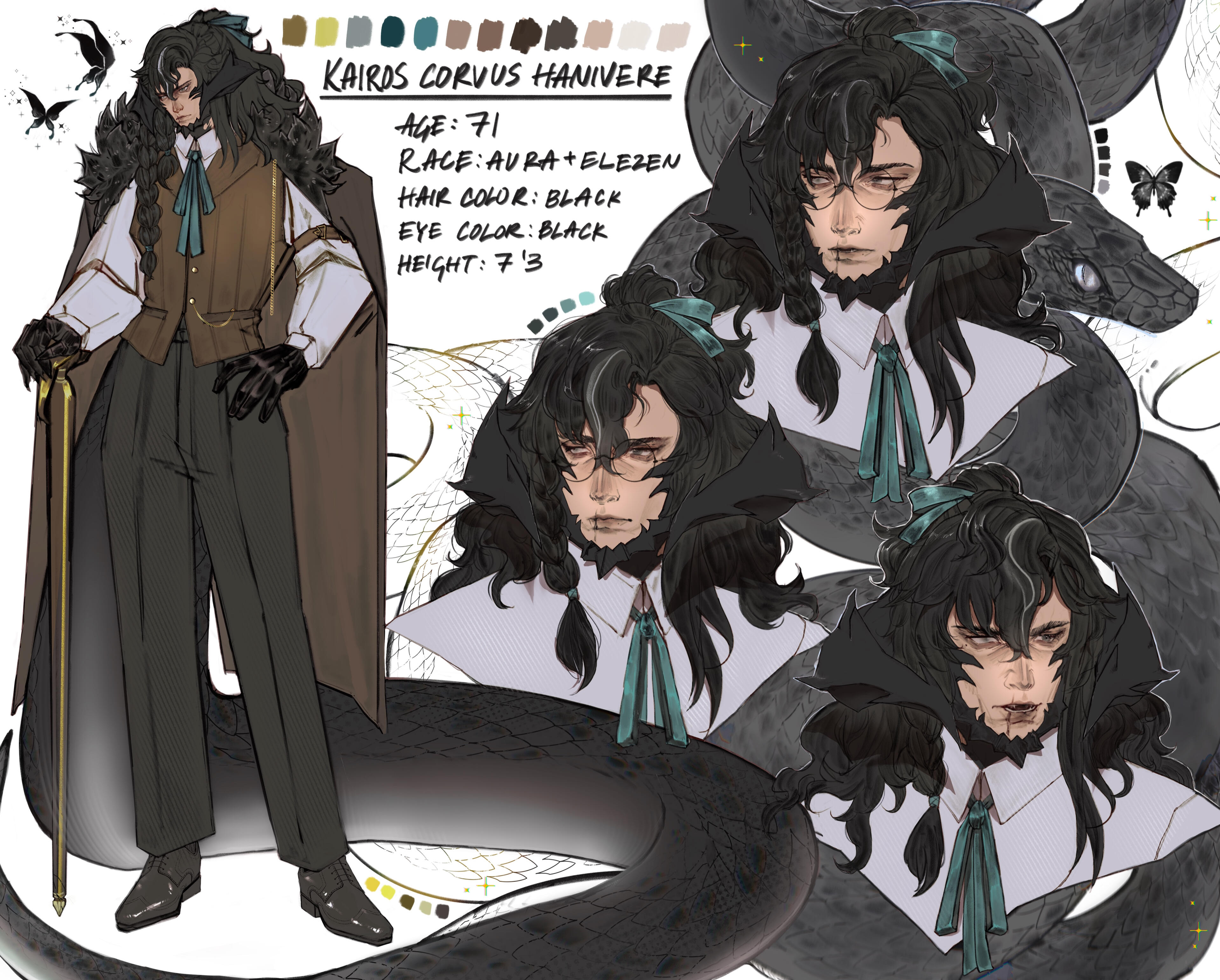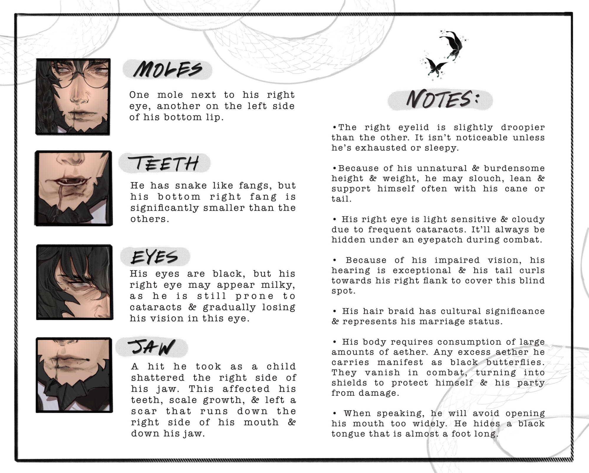 . features :. Quiet, beautiful man with a soft gaze. Often wearing circular black spectacles. Visible cataracts impair his vision over very far distances and in low light. A barely visible scar runs down the right side of his mouth, and the scales where the scar meets his jaw are broken. Half of his long hair is tied in a messy ponytail. Intricate burns race down both forearms, with barely legible text among the swirls. A handmade braided ribbon may sometimes decorate his right horn.. speech :. His sonorous voice is surprising— it sounds years older and deeper than it should, and it is often that someone will mention that it does not quite match his countenance. He may take time some time to reply, but his responses are soft and polite, formal, and one may notice he will forget to use contracting words altogether. Those attentive will notice he avoids opening his mouth too wide, even when smiling or laughing.. attire:. This man never fails to be impeccably dressed. He dresses elegantly, preferring formal three piece suits over more comfortable wear. He favors black, neutral colors and dark green fabrics, but rose gold, emerald greens, and pearl white for all accessories and hardware. All clothing is clearly tailored to flatter his form. He will very often put away his glasses for formal events. Minimal accessories are worn, as in time he has come to believe that less is more.. posture :. In familiar territory or private settings, he tends to stand with a lazy posture, commonly choosing to lean against furniture or counters, or slouching lazily over his sketchbook, drink, or meal. Otherwise he will quickly sit up or stand to his full height, especially in the presence of authority or person of interest. Someone observant might recognize the well practiced rigid posture of a former soldier.. quirks :. Most (but not all) of his mannerisms are faked or exaggerated, to better give the appearance of someone more approachable. Sweet and spicy flavor combinations are his great weakness, especially in candy and meats. His breath often smells strongly of coffee due to a caffeine addiction. When laughing or smiling genuinely, he will immediately cover his mouth or turn away. Painting took him decades to learn; all artistic creativity completely escapes him. You would be fortunate to never hear him sing, as his singing voice can be quite awful. A true citizen of Sharlayan, he has never bothered to learn to cook, especially not anything particularly tasty, only nutritious. Due to a complex upbringing, he lacks some basic knowledge including cooking, and feeding him something delicious and new will easily earn you his attention and affection.