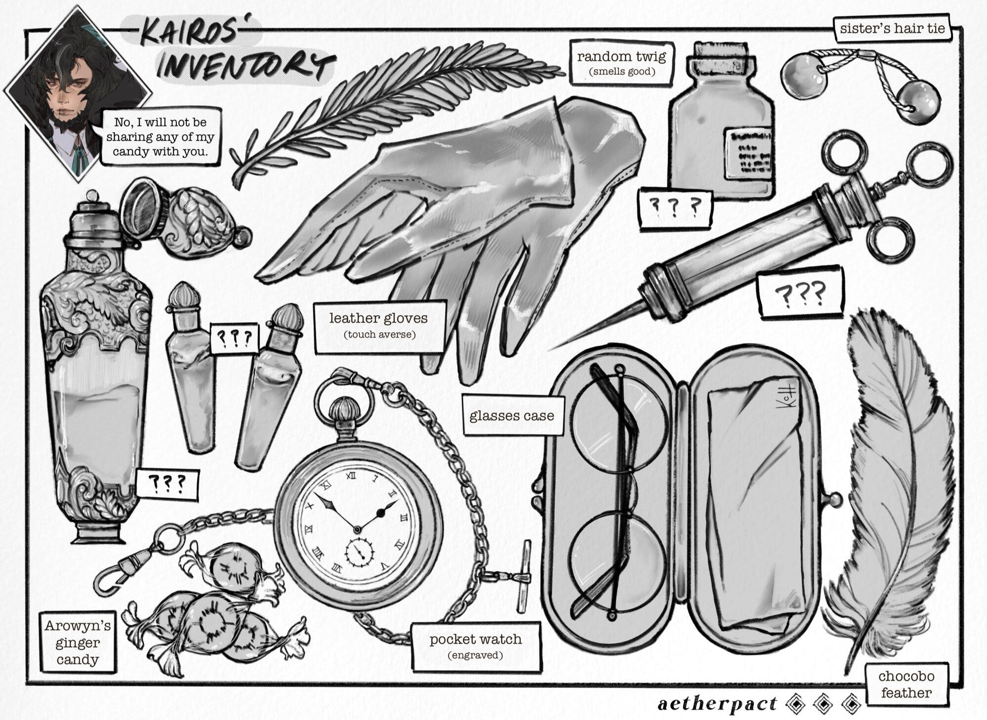 Kairos is an artist at the starlit jazz lounge TRIONFI. In exchange for a generous sum of gil, he paints the beautiful patrons that come to visit. You will find most of the sketchbooks you flip through predominantly have very adorable animals in them— quite a lot more than people, actually.⸺ AVARICIOUS .
