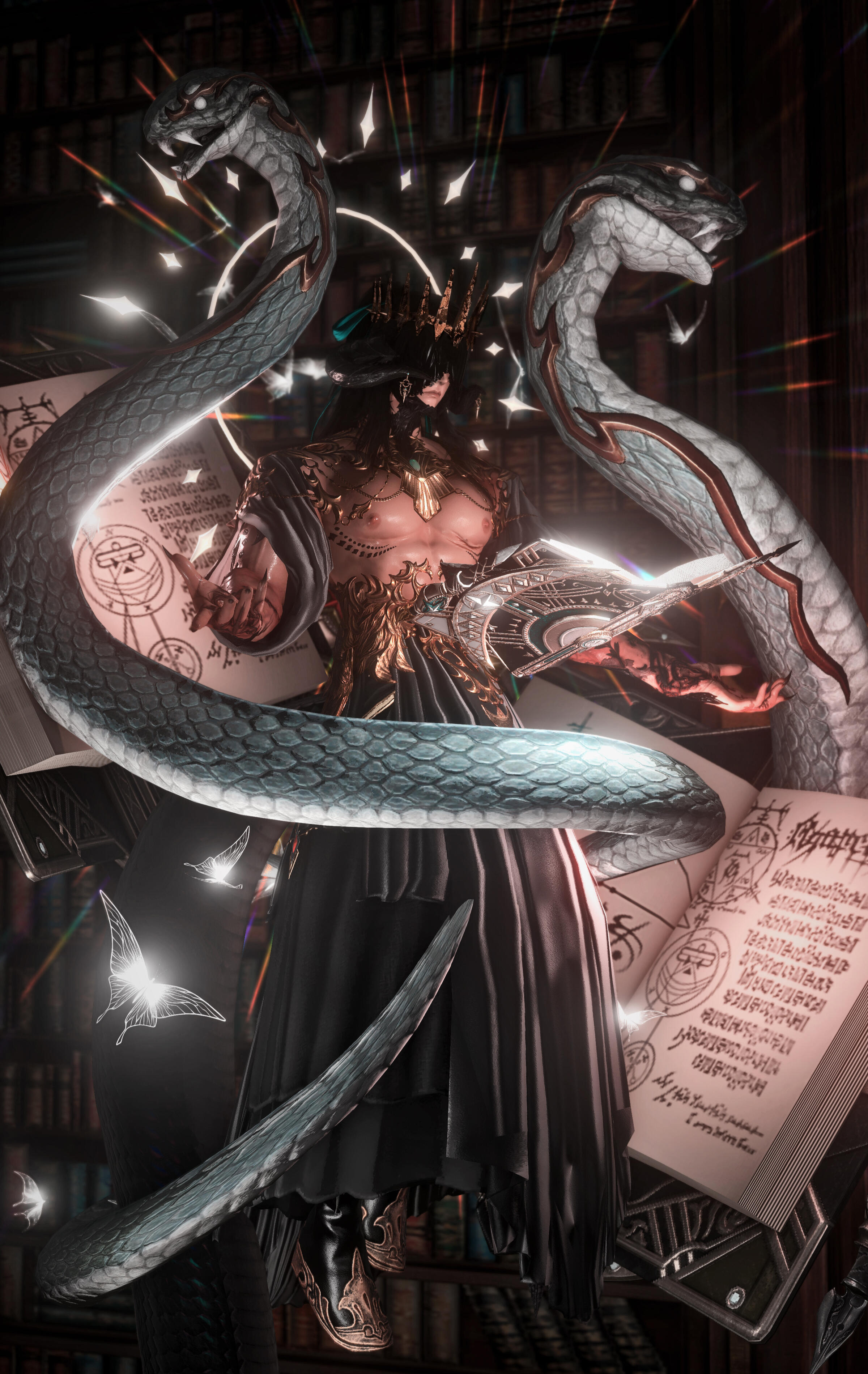 . personality :. Outside of his inner circle, he is seen as gentle, generous, studious, sensitive, polite and well mannered— a façade he uses to walk freely among nobility and high society of Old Sharlayan. Kairos is seen as quite the agreeable and soft spoken man, never putting up much of a fight, choosing instead to navigate tricky conversations with pacifism, gentleness and understanding. He is a painfully patient man, rarely breaking character, especially not in front of people he wouldn't trust with his very life.Behind a soft smile and a deep soothing voice, Kairos is an information collector, quietly hoarding information to sell or use for his own purposes. When one would suspect threats and violence won't make the target speak, this two faced snake can befriend and lull them into a sense of safety with gentle smiles and honeyed words to smoothly extract sensitive information, with not much fuss or bloody mess involved. When he strikes a conversation with a target of interest, he aims to dissect their character, find their quirks, and memorize their mannerisms for possible future use.However, inside his inner circle he is playful, immature, childish at times, and a man of extremes. Provoking, prodding and button pushing are his greatest vices— he likes to relieve himself of his boredom by eliciting reactions out of people, riling them up as well as winding them down. He has learned to love rules, finding that he can dance around them effectively and use them to his advantage. He may often come off as lazy, always choosing to shirk work and responsibilities off to others if he can successfully convince them.. history :. As the eldest son of five in one of the oldest families in Ul'dah, Kairos was designed, conditioned and raised perfectly by his family. Any flaws -- emotion, bothersome tics, unbecoming mannerisms, stuttering -- were beaten and buffed out quickly, turning him into a quiet, obedient but violent teenager waiting for any situation to justify his explosive anger and cruelty. With no option but to follow the strict life plan set out for him by the head of family, he started his paladin training early in adolescence.Venting his frustration in battle temporarily relieved him of violent tendencies and anger issues, and so with newfound ambition, focus, and full intention to become head of his family, he trained aggressively to become a Sultansworn Paladin.[ work in progress ]